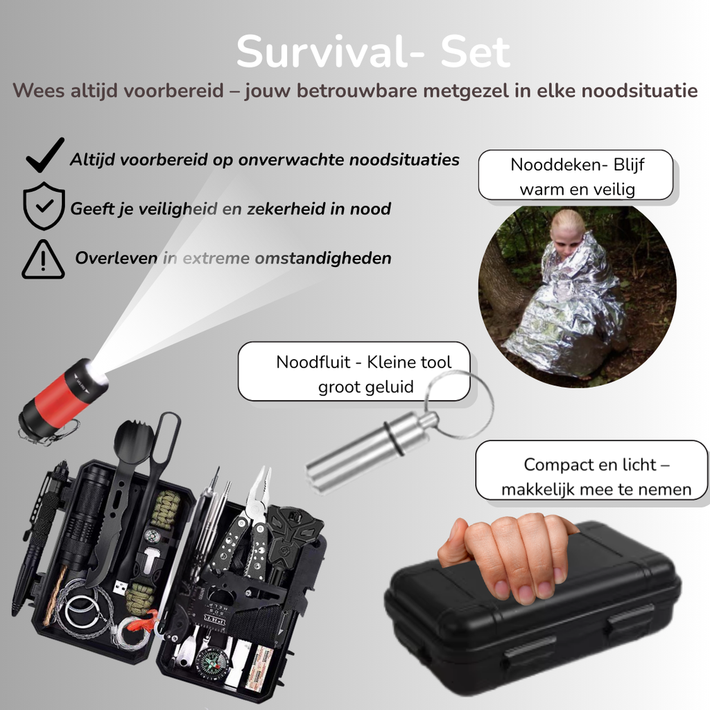 Inclusief o.a. tactische zaklamp, multitool tang, survival armband met kompas en fluitje, vuurstarter, draadzaag, noodfluitje, camping bestek, 10 warmtedekens en meer – allemaal opgeborgen in een stevige case. -